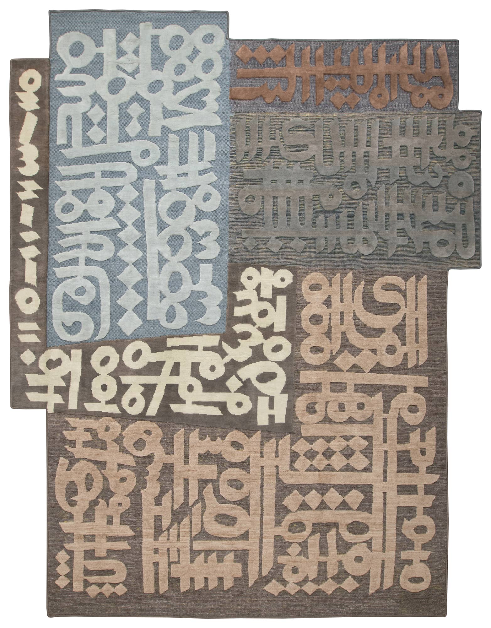 MirMola Sorya addresses this issue in his carpets, merging design, textile art, and architecture to create a dialogue between contemporary and traditional art. His work features interwoven frames and vibrant, complex patterns inspired by Iranian muraqqa and abstract expressionism, enhancing both aesthetic and meaning.