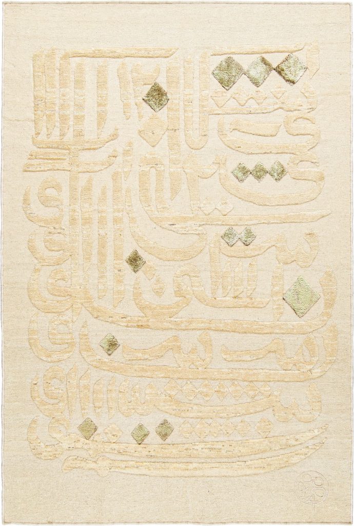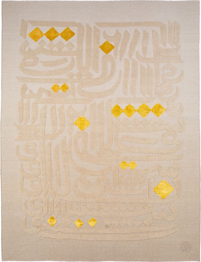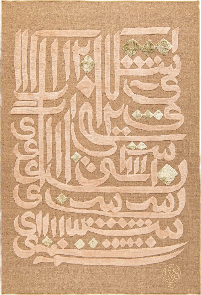 In this work, if you look at the carpet in a square and rectangular shape which is a symbol of the earth, the world، the house, and the foundation; abjad letters and swords give a symbolic meaning to it’s spirit.